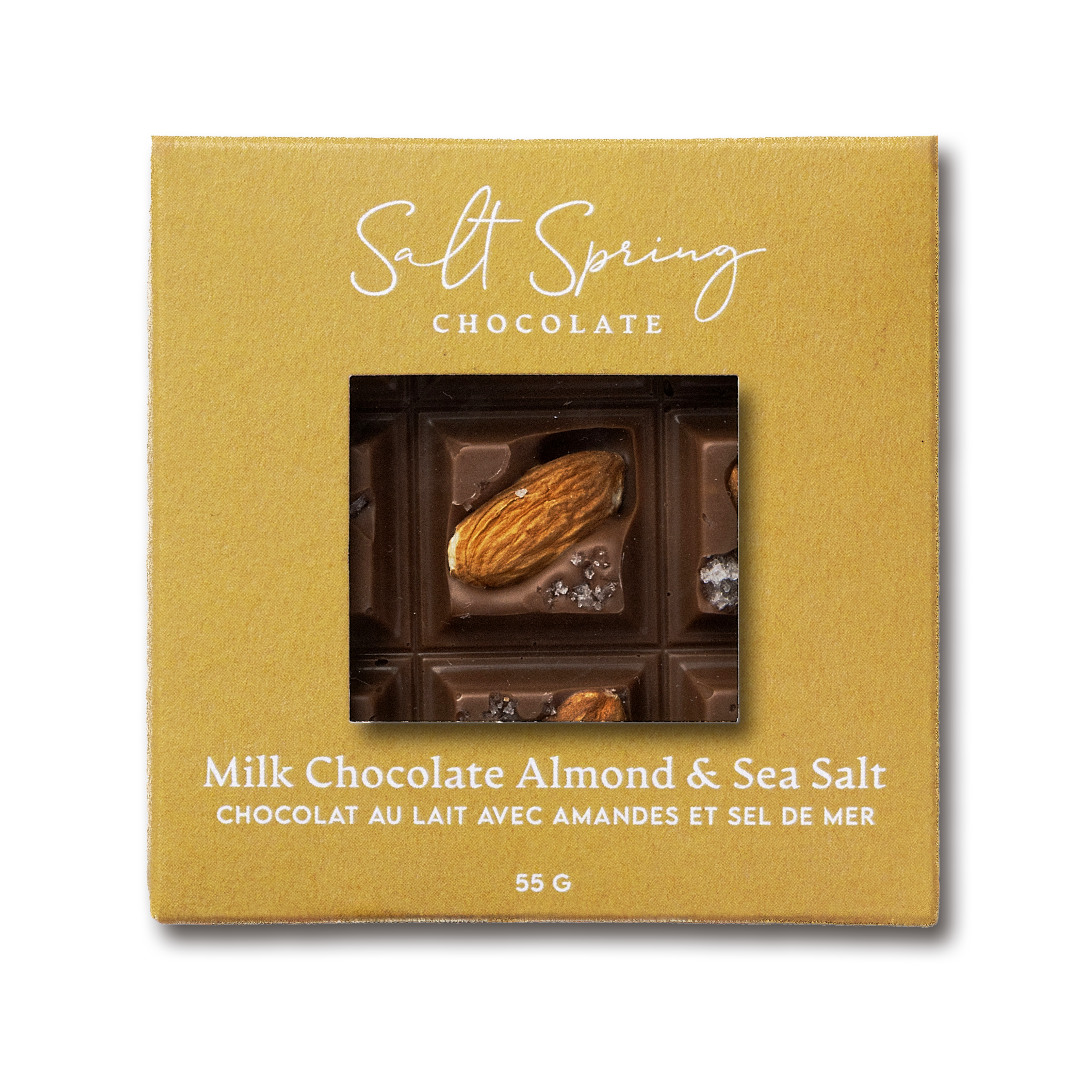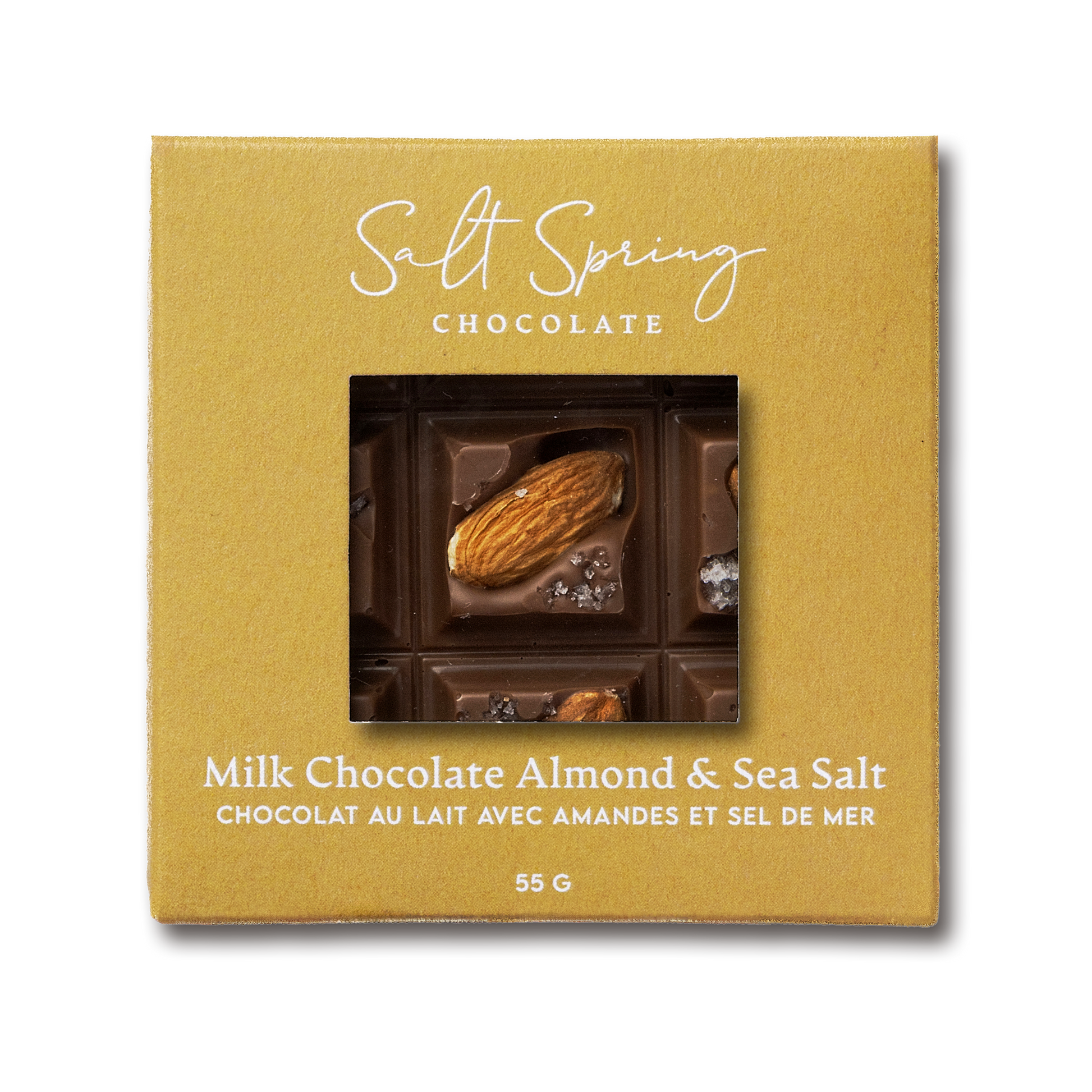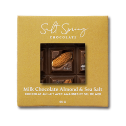 The natural beauty of almonds peeking through delicicious Milk Chocolate & Salt Spring Sea Salt.