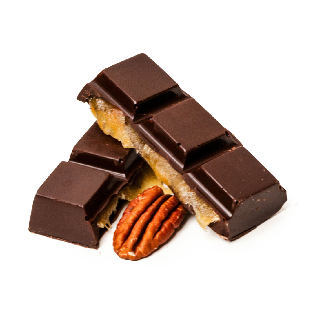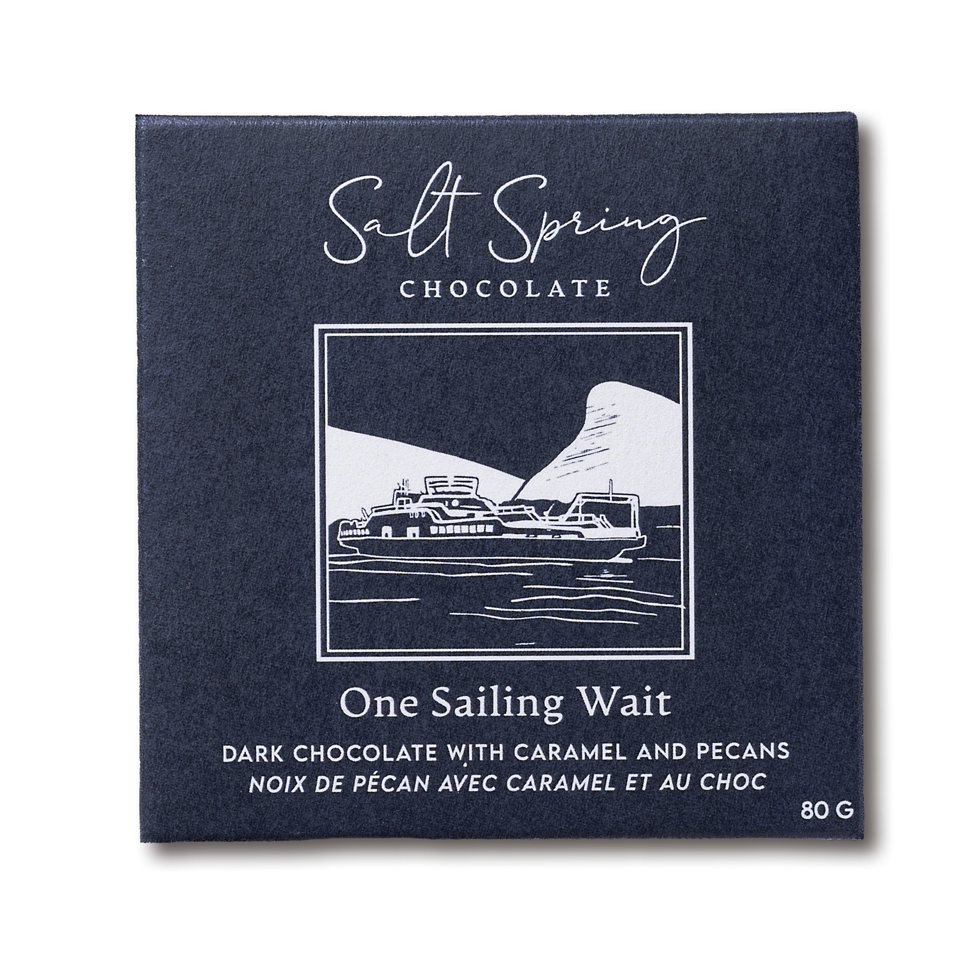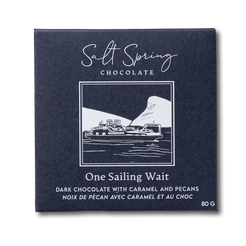 Savoring a One Sailing Wait dark chocolate bar, enhanced with the decadent flavors of sweet salty caramel and crunchy pecans, perfect for those drawn-out moments spent waiting to load the ferry or compensate ever so sweet for not making it.